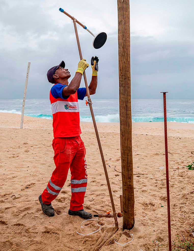 Uma força-tarefa da Secretaria de Energias Renováveis e Iluminação Pública foi realizada nesta quinta-feira (22/01) na Orla de Itaipuaçu, em Maricá. A ação teve caráter preventivo e resultou na notificação de estabelecimentos comerciais, além da remoção de chuveiros e ligações elétricas irregulares instalados na faixa de areia.
