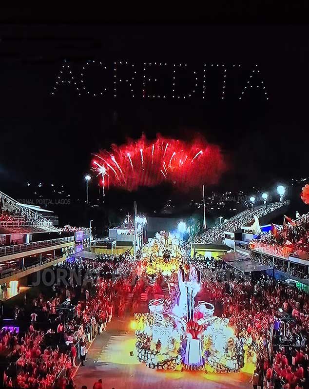 Os equipamentos formaram imagens no céu e projetaram palavras como “Maricá” e “Acredita”, além de desenhos ligados ao enredo Balangandãs e Berenguendéns, criando um dos momentos visuais mais comentados da apresentação.